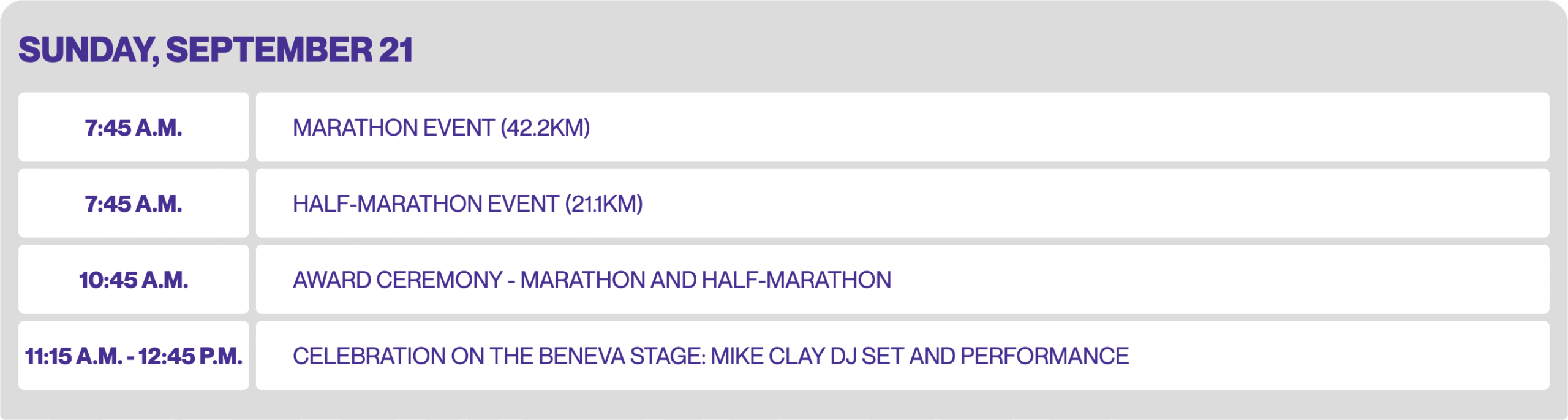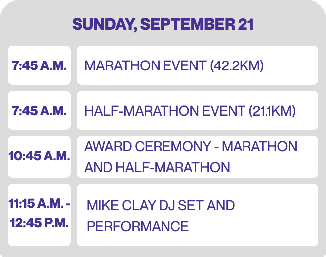 • Half-Marathon & Marathon → Sunday, September 21 at 10:45 a.m.