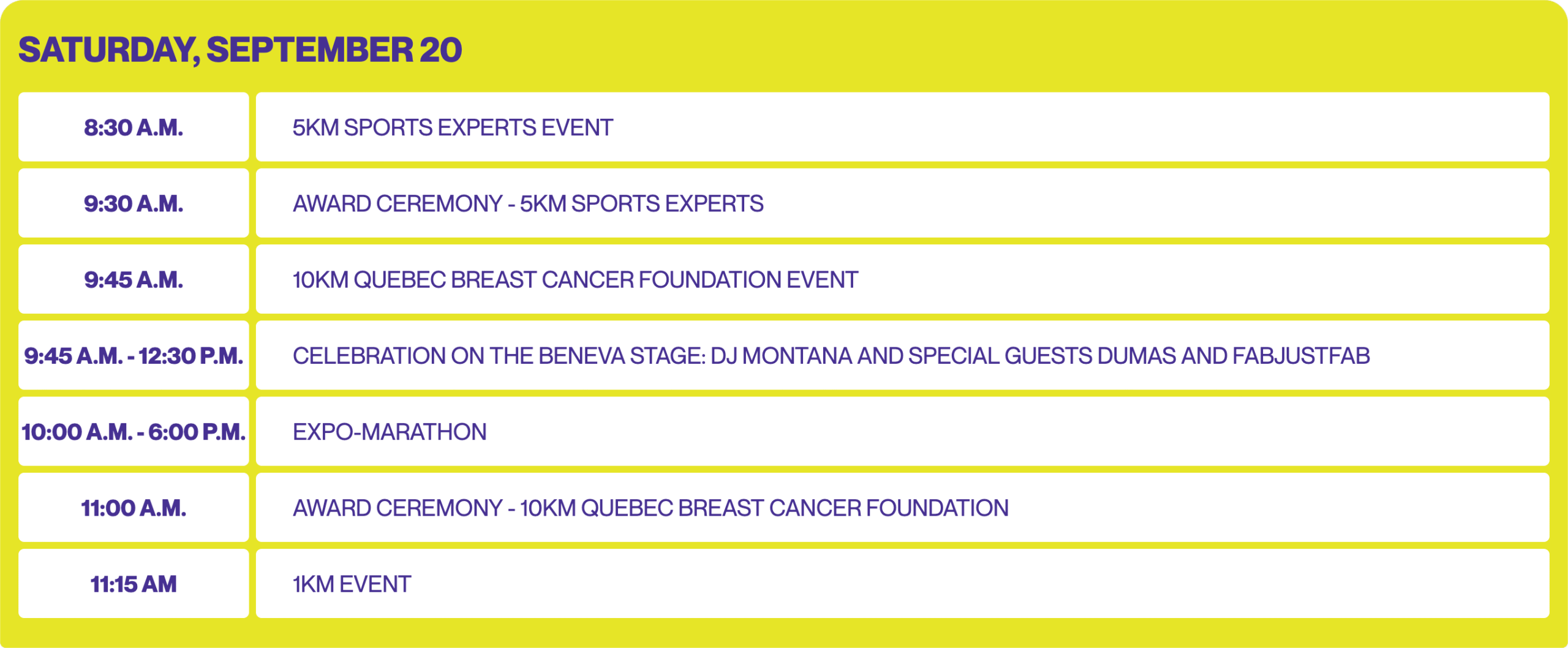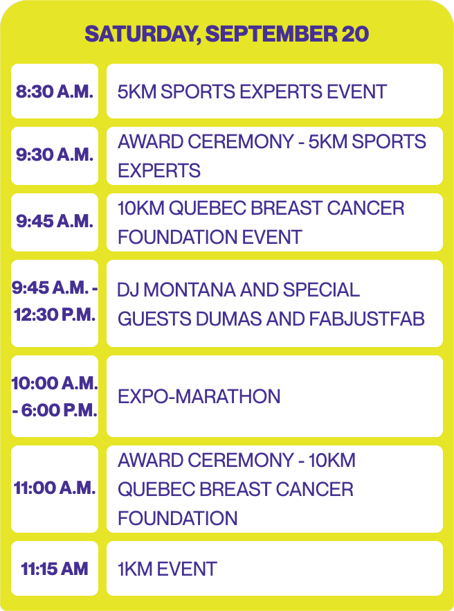 • 5 km Sports Experts & 10 km Breast Cancer Foundation → Saturday, September 20 at 10:45 a.m.